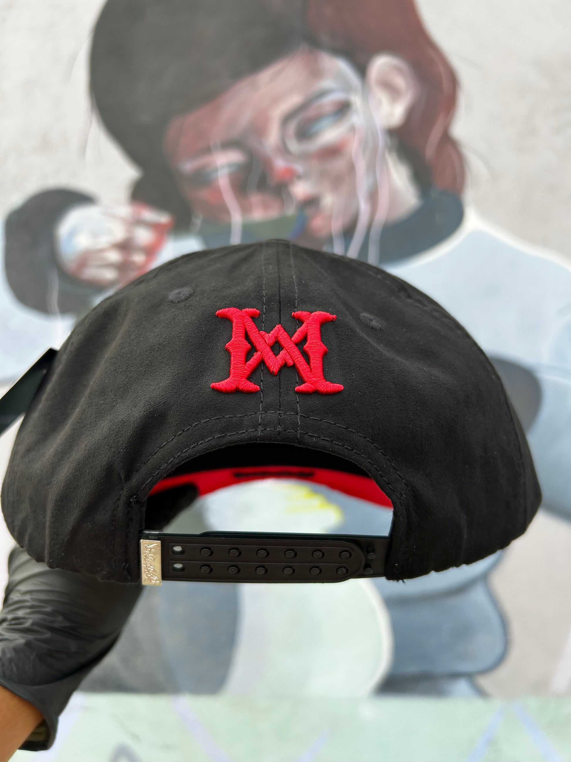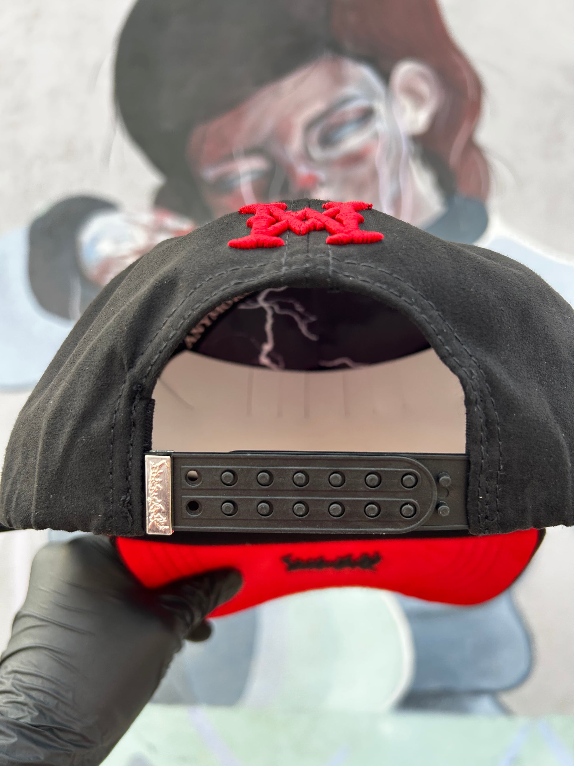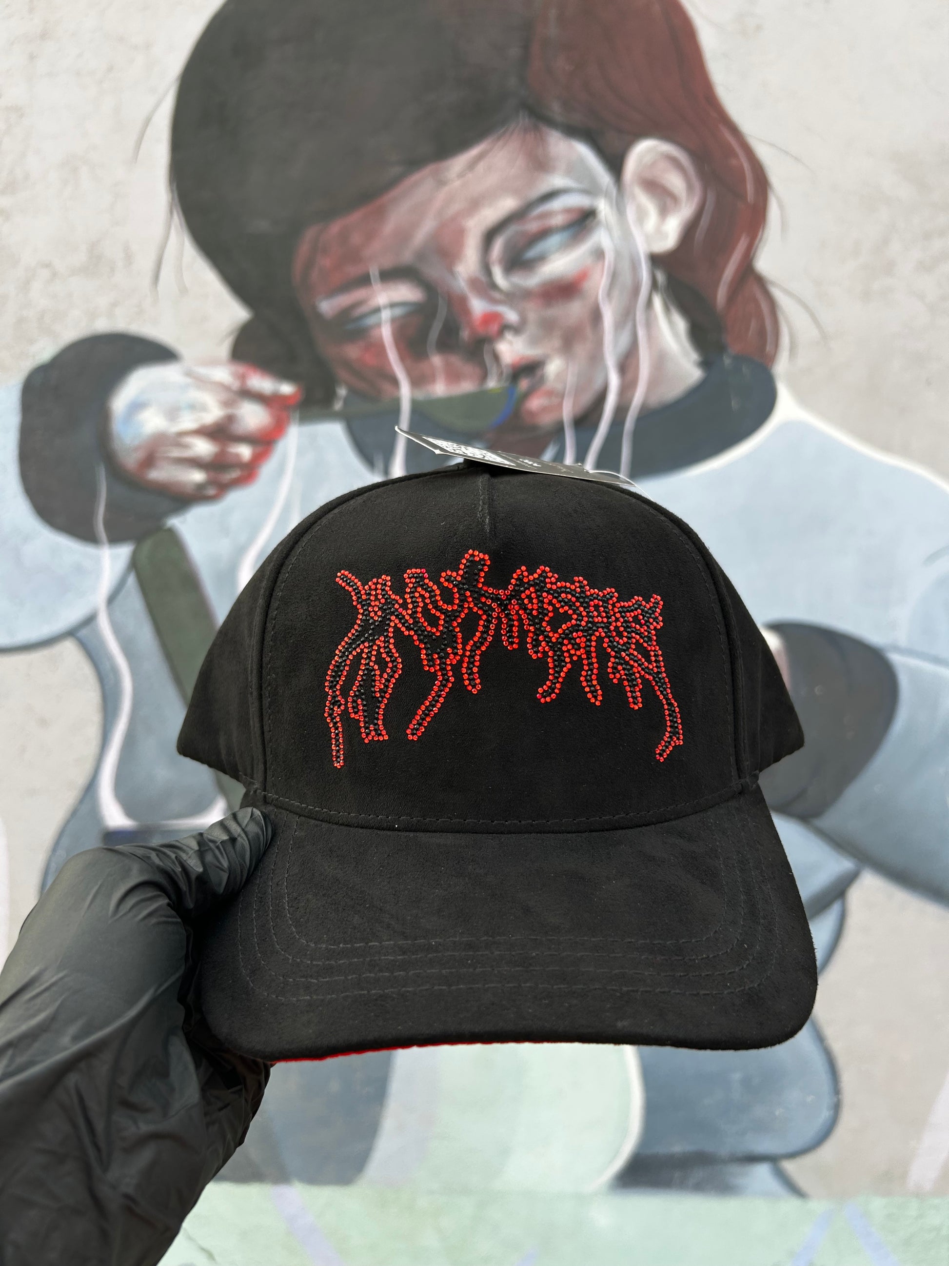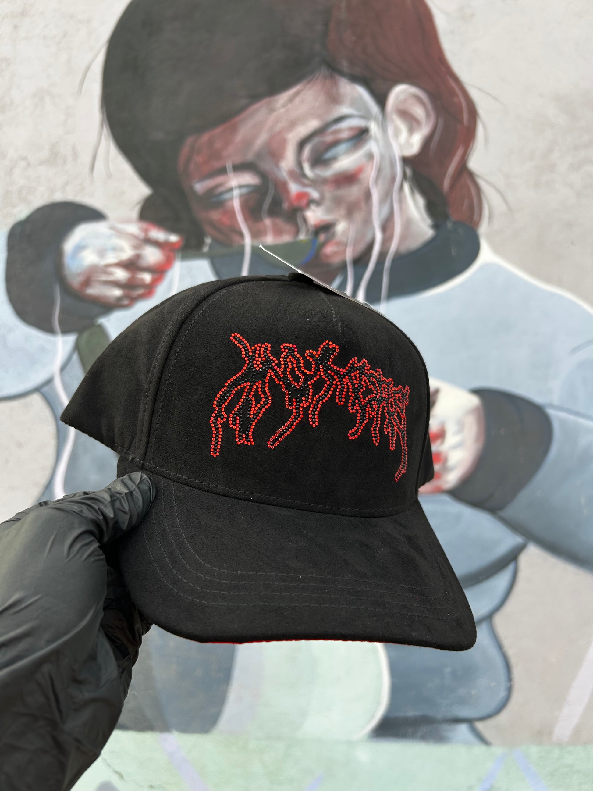 Confeccionada completamente en gamuza de alta calidad, esta gorra destaca por sus cristales incrustados en tonos negro y rojo, creando un contraste impactante y elegante. Un modelo único que te hará lucir con actitud y brillar con personalidad.