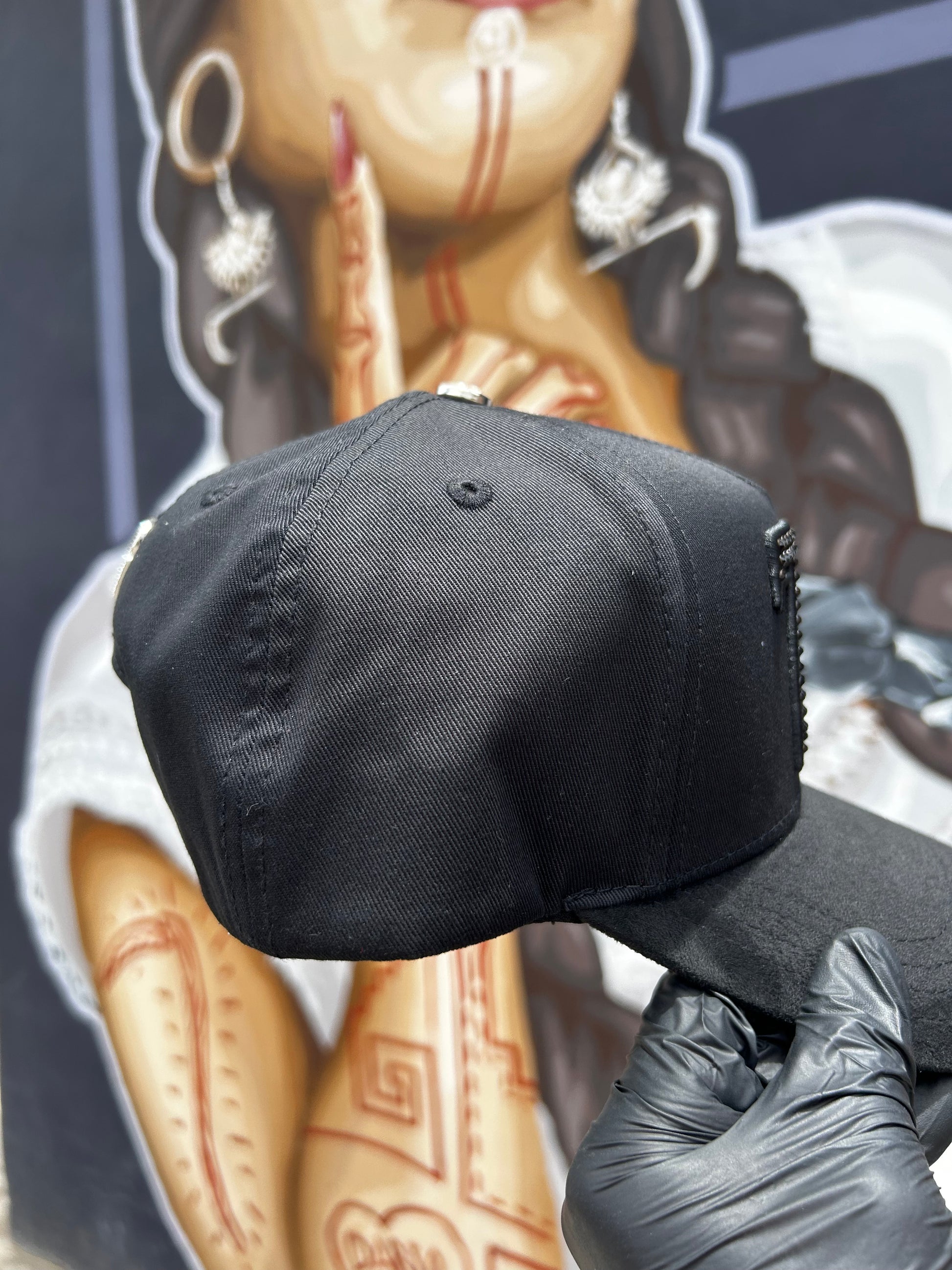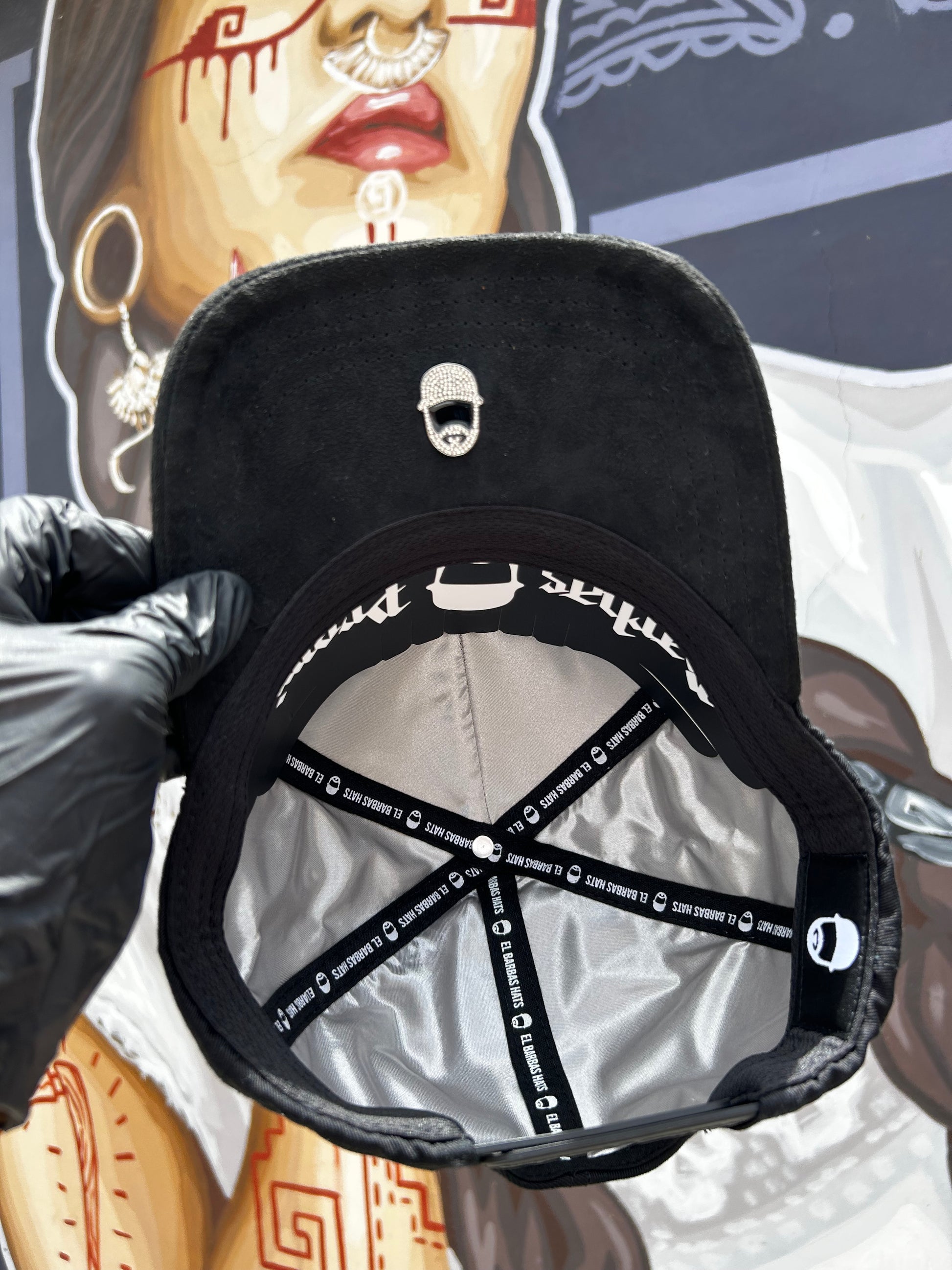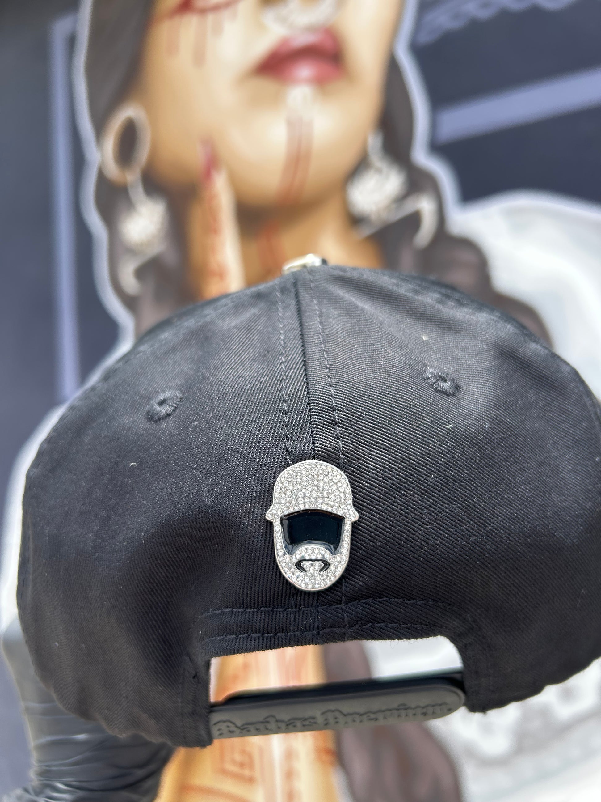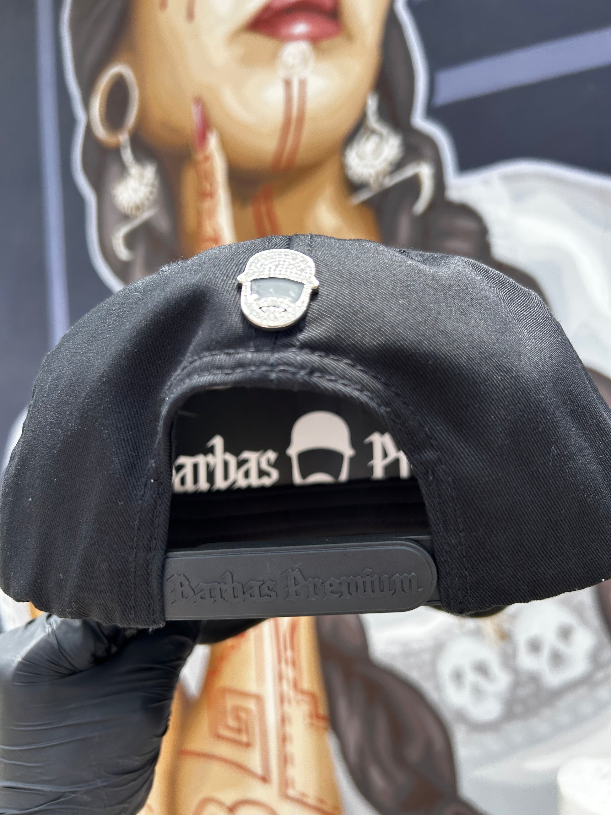 Una gorra negra elegante y única, con cristales incrustados en el frente, la parte trasera y bajo la visera, destacando el icónico logo de Barbas Hats. Perfecta para quienes buscan un estilo que brille con personalidad. ¡Hazla tuya y roba miradas donde vayas!